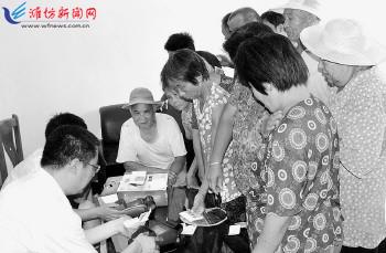 ◤临朐县不断改善新农保服务方式,促进新农保试点工作扎实开展。图为工作人员利用刷卡机上门为参保人群提供“一站式”新农保养老金领取服务。 井维旭摄